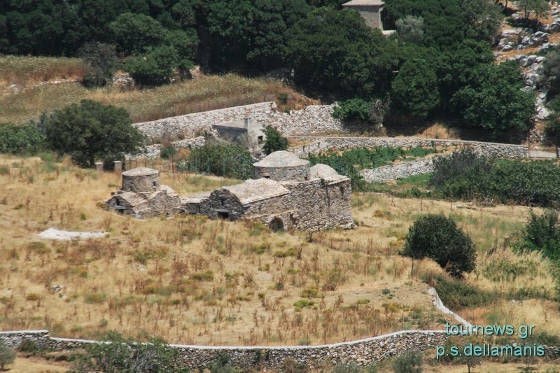 <<Μικρός δίδυμος βυζαντινός ναός στη θέση Καλοκώστα, <<στου παπά το μύλο>> με ιδιαίτερο αρχιτεκτονικό και αγιογραφικό ενδιαφέρον. Για τους ναούς αυτός ο αείμνηστος Ν. Καλογερόπουλος έγραψε παλιότερα: <<... Επιστρέφοντες εις Απείρανθον δι' άλλης οδού όχι καλλιτέρας, φθάνομεν εις τους δίδυμους ναούς του Αγίου Παχωμίου και Αγίου Γεωργίου. Ούτοι δεν είναι οι τελευταίοι ενταύθα.... Πάντως, καιούτοι παρουσιάζουν ιδιάζον ενδιαφέρον, ο μεν μικρός του Παχωμίου δια το ζωγραφικόν διάκοσμον, ο δε δια το περίεργον κτιστόν χώρισμα του ιερού. Αρκεί να αναφέρω ωραιοτάτην κεφαλήν Αγίου δια να θαυμάσει τις την απλότητα, τον αυθορμητισμό, την ζωηρότητα και τον νατουραλισμόν της τέχνης του ναϋδρίου του Αγίου Παχωμίου ή Άη Παχύ, όπως τον καλούν. Ενθυμίζει τας ωραιοτέρας και ρεαλιστικωτέρας κεφαλάς, της ακμής των Παλαιολόγων και τινα εκ των μωσαϊκών της Νέας Μονής εν Χίω...>>