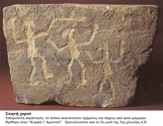 Βραχογράφημα: Τα σημαντικότερα, ίσως, εκθέματα του μουσείου είναι οι μοναδικές στο είδος τους επίκρουστες πλάκες από την Κορφή τ' Αρωνιού, γνωστότερες ως πετρογραφήματα, βραχογραφήματα ή βραχογραφίες. Πρόκειται για πλάκες ακανόνιστου σχήματος από γκρίζο λίθο ή λευκωπό μάρμαρο που φέρουν στη μιά τους μόνο πλευρά παραστάσεις ή σύμβολα που έχουν αποδοθεί με την τεχνική της επίκρουσης. Εικονίζονται σκηνές κυνηγιού, ανθρώπινες μορφές που χορεύουν καθώς και σκηνή φιλονικίας Σπείρασε πλοίο. Άλλες πλάκες φέρουν αφηρημένα γραμμικά σχέδια (σπείρες), που ερμηνεύτηκαν από τον Μιχάλη Μπαρδάνη ως σύμβολα αστερισμών και ενέπνευσαν τη μελέτη του: "Στοιχεία από τις αστρονομικές γνώσεις των προϊστορικών κυκλαδιτών".