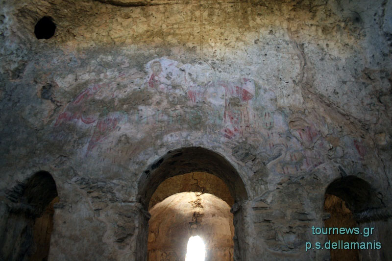 Υπέρ την θύραν και τα παράθυρα του <<τέμπλου>> επί της Δ. παρειάς του σώζονται λείψανα τοιχογραφίας: εις τας αντυγάς των τόξων πλατεία κυανή διακοσμιτική ταινία με λευκούς δίσκους, εν οις ερυθροί σταυροί και ανωτέρω, εις το μέσον υπολείμματα ενθρόνου προσώπου και εκατέρωθεν του δεομένων μορφών, εξ ών η αριστερά ίσως κύπτει πολύ. Μεταξύ αυτής και του θρόνου επιγραφή και χρονολογία: