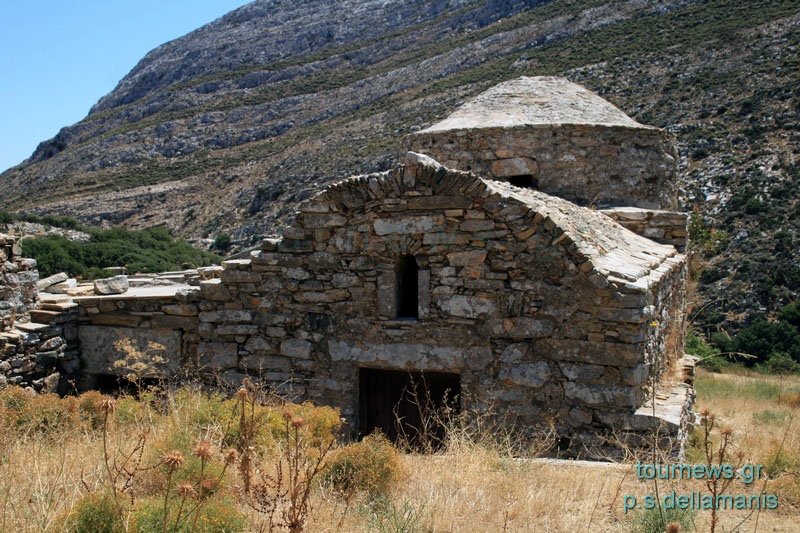 <<Μικρός δίδυμος βυζαντινός ναός στη θέση Καλοκώστα, <<στου παπά το μύλο>> με ιδιαίτερο αρχιτεκτονικό και αγιογραφικό ενδιαφέρον. Για τους ναούς αυτός ο αείμνηστος Ν. Καλογερόπουλος έγραψε παλιότερα: <<... Επιστρέφοντες εις Απείρανθον δι' άλλης οδού όχι καλλιτέρας, φθάνομεν εις τους δίδυμους ναούς του Αγίου Παχωμίου και Αγίου Γεωργίου. Ούτοι δεν είναι οι τελευταίοι ενταύθα.... Πάντως, καιούτοι παρουσιάζουν ιδιάζον ενδιαφέρον, ο μεν μικρός του Παχωμίου δια το ζωγραφικόν διάκοσμον, ο δε δια το περίεργον κτιστόν χώρισμα του ιερού. Αρκεί να αναφέρω ωραιοτάτην κεφαλήν Αγίου δια να θαυμάσει τις την απλότητα, τον αυθορμητισμό, την ζωηρότητα και τον νατουραλισμόν της τέχνης του ναϋδρίου του Αγίου Παχωμίου ή Άη Παχύ, όπως τον καλούν. Ενθυμίζει τας ωραιοτέρας και ρεαλιστικωτέρας κεφαλάς, της ακμής των Παλαιολόγων και τινα εκ των μωσαϊκών της Νέας Μονής εν Χίω...>>
