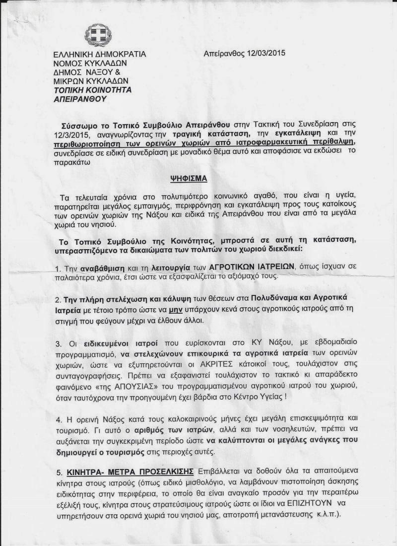 Σε δυναμική κινητοποίηση προχώρησαν το πρωί της Παρασκευής κάτοικοι και φορείς της Απειράνθου Νάξου με μπροστάρη τον πρόεδρο του χωριού Γιώργο Μπάκαλο και το τοπικό συμβούλιο της κοινότητας. Η βροχή που έπεφτε ασταμάτητα στη Νάξο, δεν πτόησε τους πάνω από 100 Απεραθίτες που βαδίζοντας στα αχνάρια του αγωνιστή συμπατριώτη τους Μανώλη Γλέζου, βροντοφώναξαν στο προαύλιο του Νοσοκομείου "Θέλουμε γιατρό και όχι εμπαιγμό", "Έχουμε δικαίωμα όλοι στην υγεία κι